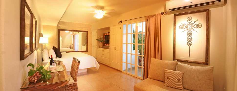 Our Junior Suite is a charming room which overlooks the town square. It has a king-size bed with a pillow-top mattress, air-conditioning, ceiling fan and two balconies, one quite large with a table and chairs. Amenities offered are cable television, 32 inch LCD TV, bottled drinking water and free WiFi.