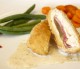 Pechuga empanizada rellena de queso de cabra y albahaca, bañada con una salsa de champiñones al vino blanco.